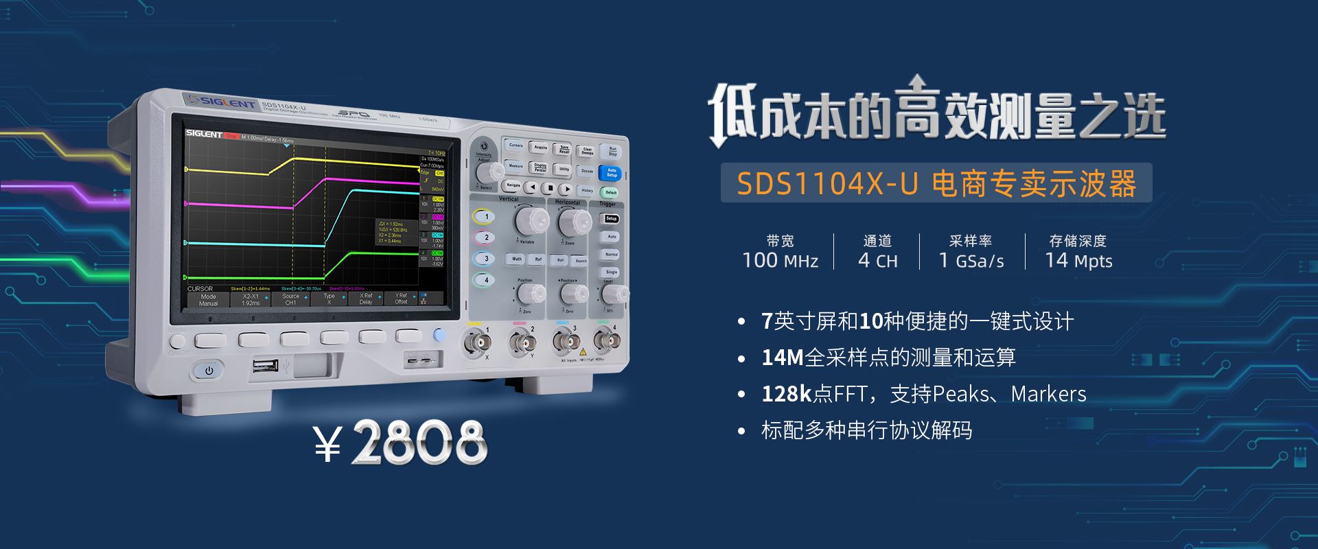 作為入門級數字示波器,SDS1104X-U帶寬100 MHz,采樣率1 GSa/s,能滿足工程師大部分的信號測量需求。10種便捷化一鍵操作,38種自動測量功能,...